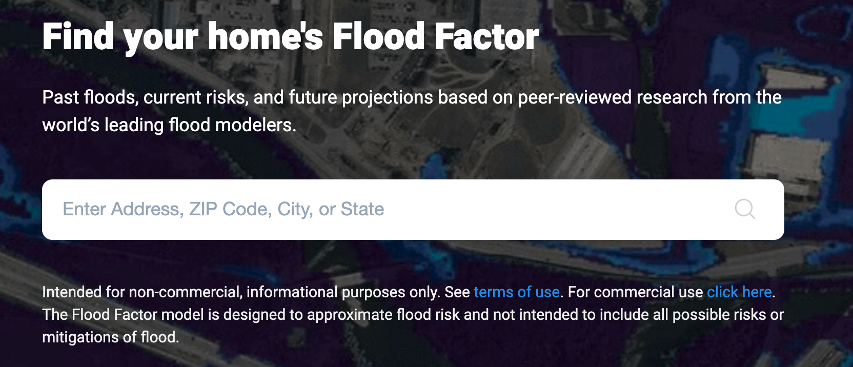 While I could go on and write about its features and benefits, the best way to learn about and appreciate its usefulness is to go to their site and put in an address. www.floodfactor.com Below is a screenshot of the home page to show just how simple it is. Not only will you almost instantly receive your risk rating, it will give a few pages of additional information with elegance, clarity, and simplicity.
