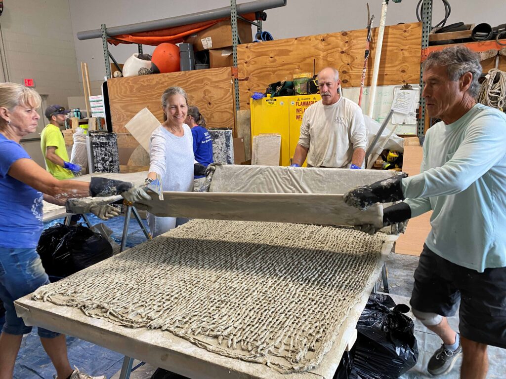 A PROS development team led by Mark Clark, an associate professor of wetland ecology in the UF/IFAS department of soil, water and ecosystem sciences created a new product from jute netting and calcium sulfoaluminate, a cement material. Referred to as jute-reinforced calcium sulfoaluminate (JR-CSA), it can be molded into various shapes, such as the prisms and panels featured in the manual. It’s strong, fast setting, stronger than Portland cement and doesn’t shrink much. It’s also biodegradable and has a lower carbon footprint than cement options.