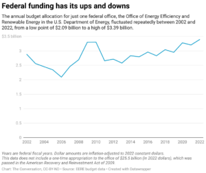 Then in 2009, following the Great Recession, Congress gave EERE $16.7 billion – most of which was to help low-income families pay to install efficient light sources or insulation to save them money. About $5.4 billion was for research and development.